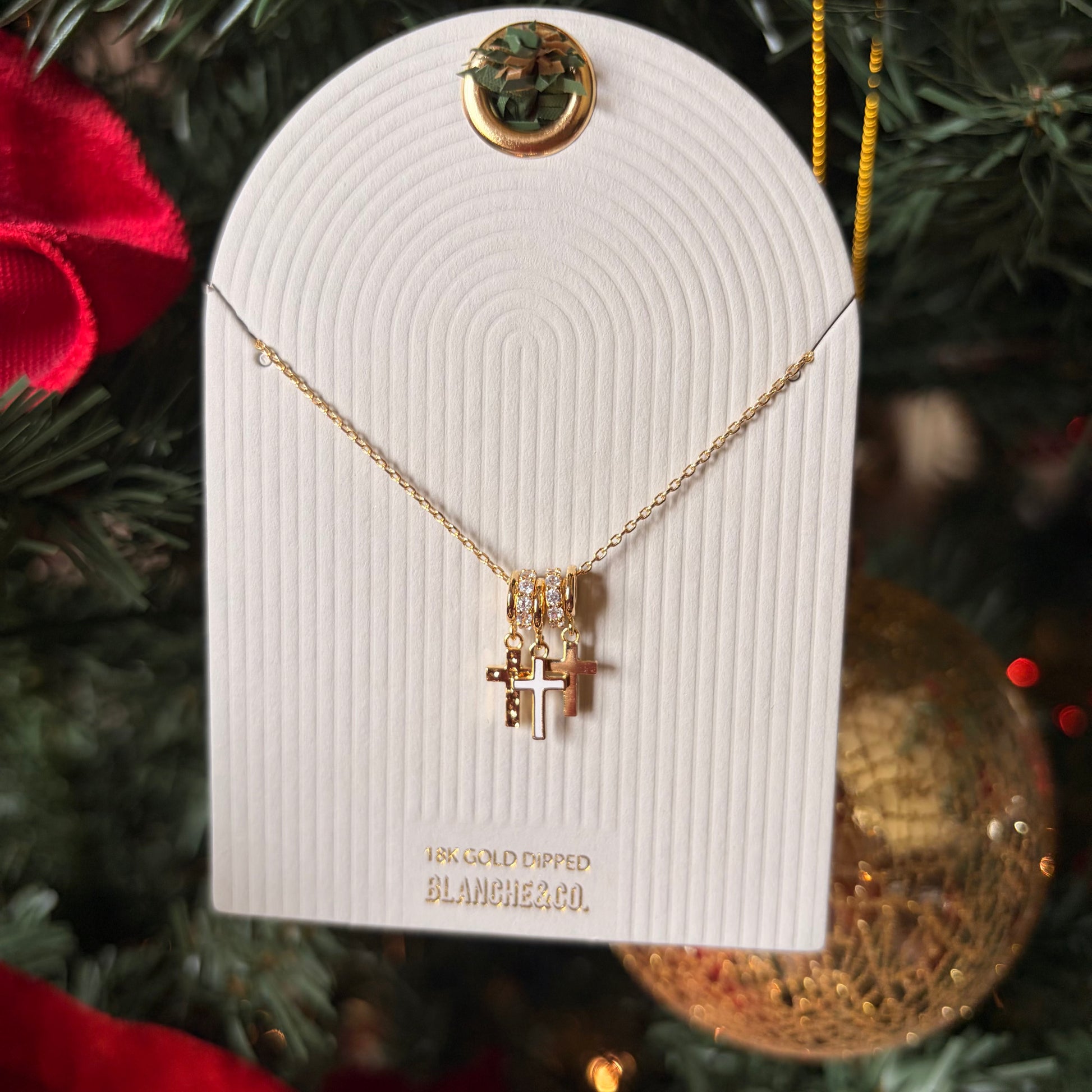 Add some charm and sparkle to your wardrobe with Cross Trio. This 18k gold dipped necklace is not only water resistant, but it's the perfect addition to any outfit. A must-have accessory for those looking to add some playful flair to their style!