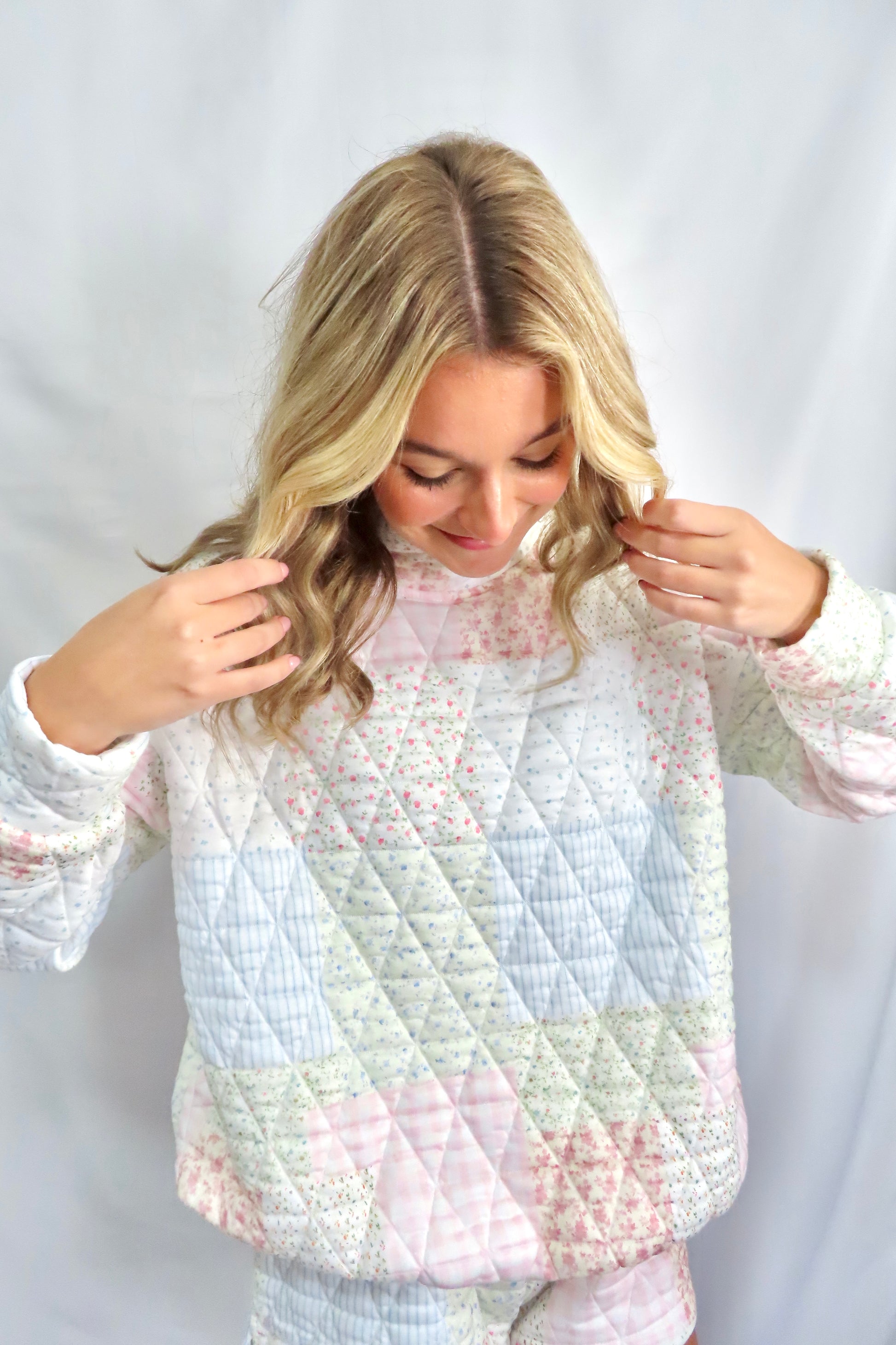 Get swept away in cozy comfort with the Frosted Cloud Set — a dreamy quilted matching set that feels just as soft as it looks. Designed with an intentionally oversized fit, this set features a pastel patchwork pattern in shades of pink, blue, and cream for a playful, vintage-inspired look.
