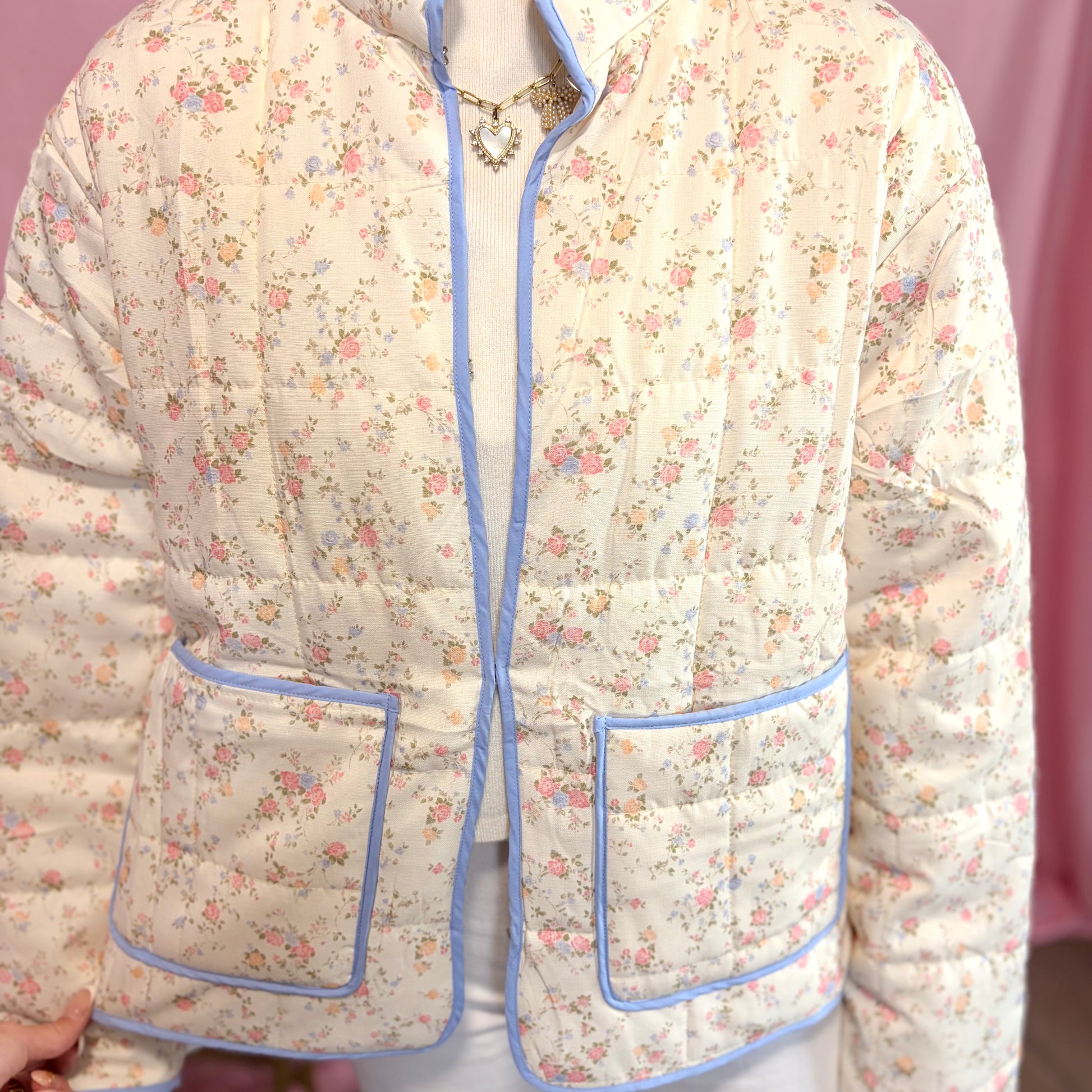 The Love Letter Quilted Jacket features a soft cream base with delicate floral detailing and the prettiest baby blue trim throughout!