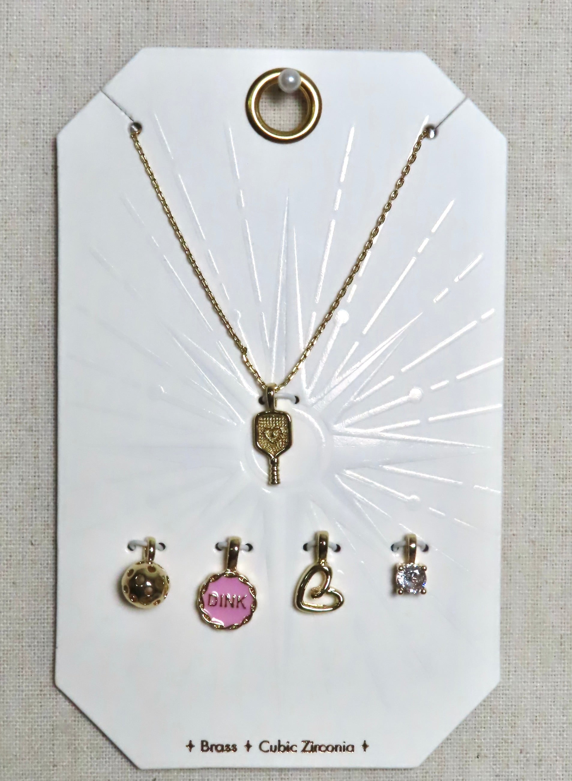 A playful statement piece for pickleball lovers. The Pickleball Charm Necklace features a gold-tone chain with five interchangeable charms β designed to mix, match, and style your way.