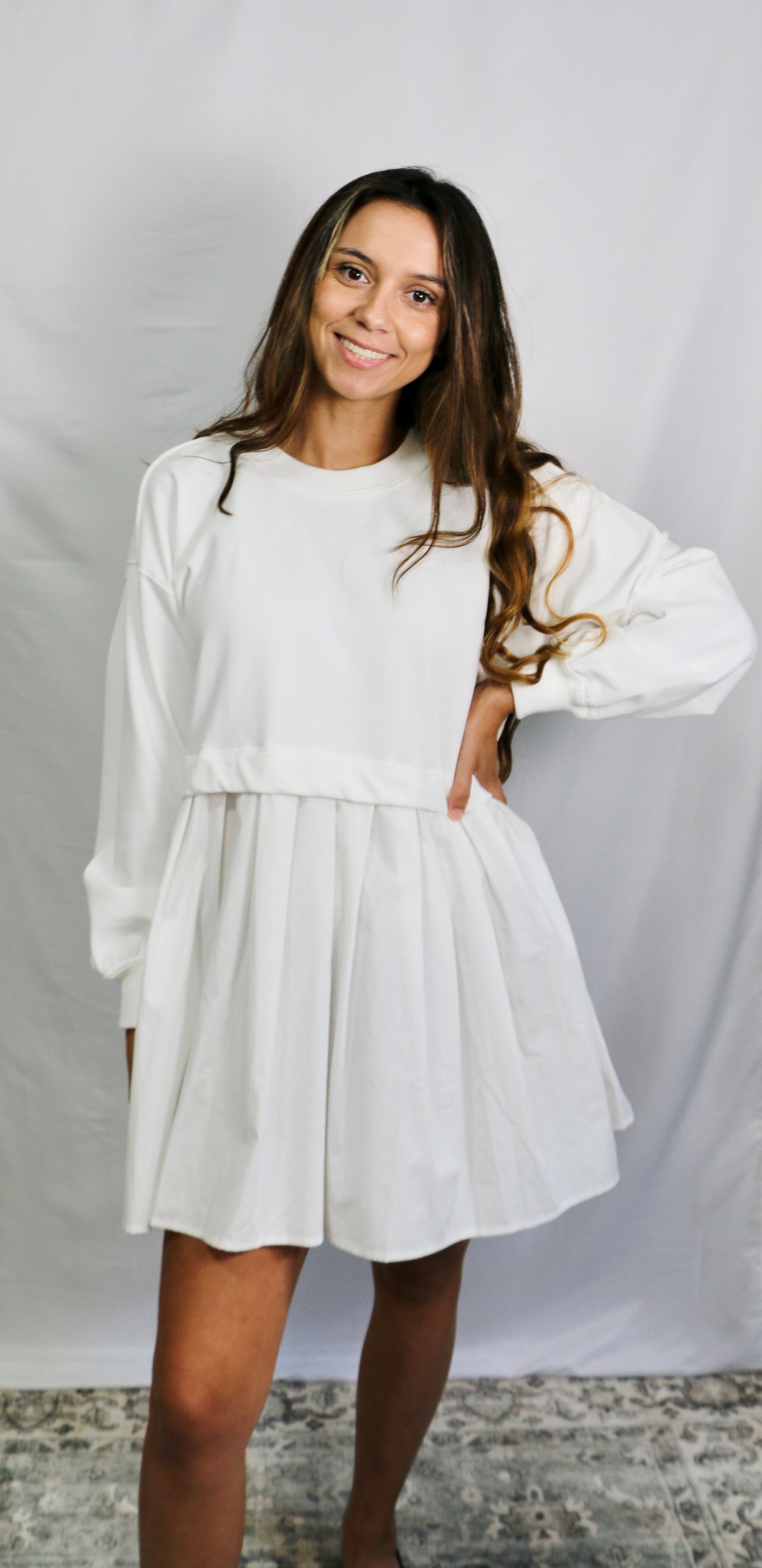 Effortless, chic, and oh-so-comfy — the ROMY Layered Dress is your new favorite all-in-one outfit. Designed with a soft sweatshirt-style top and a pleated mini skirt bottom, it gives the illusion of a perfectly layered look without any extra effort.