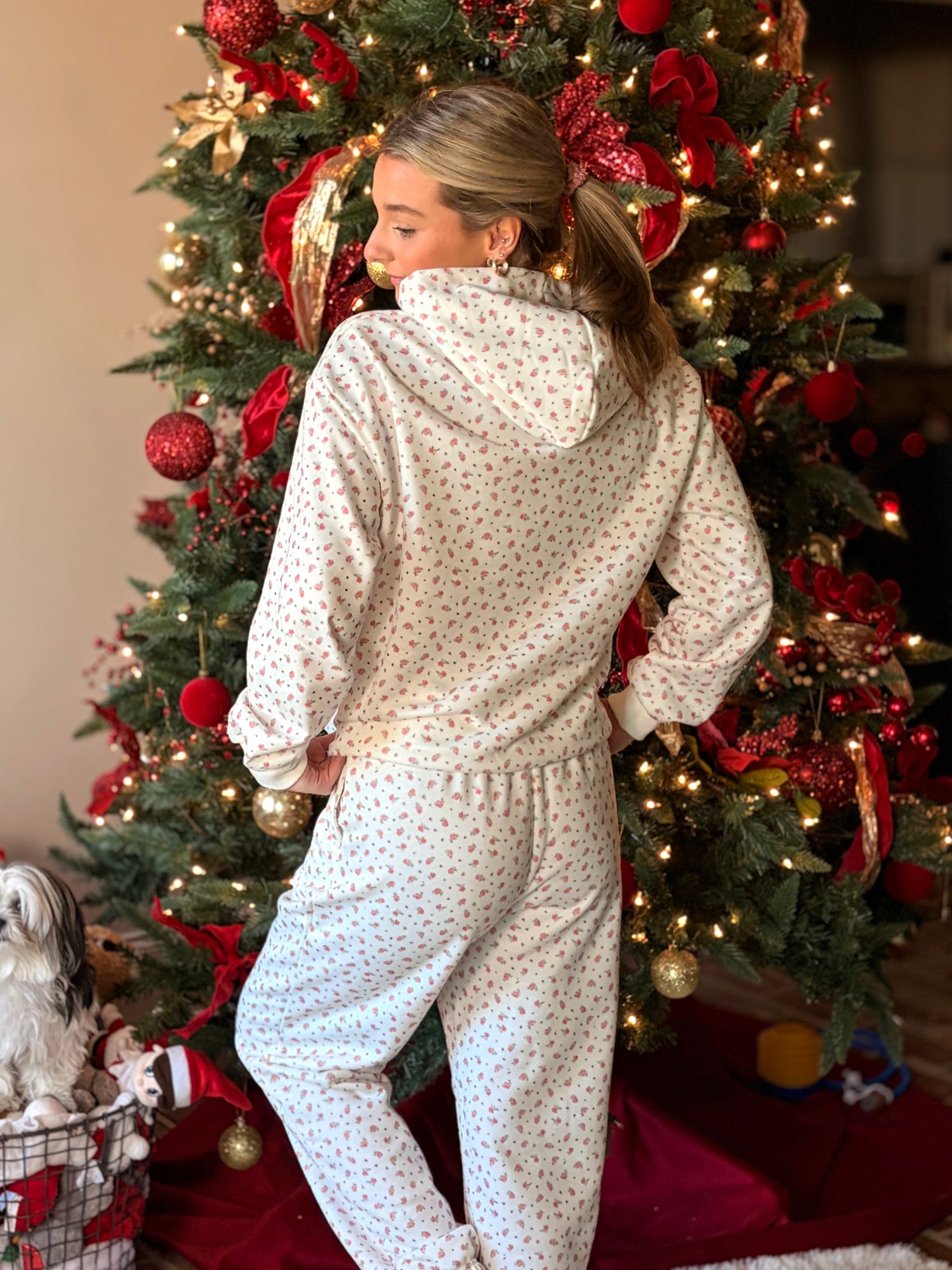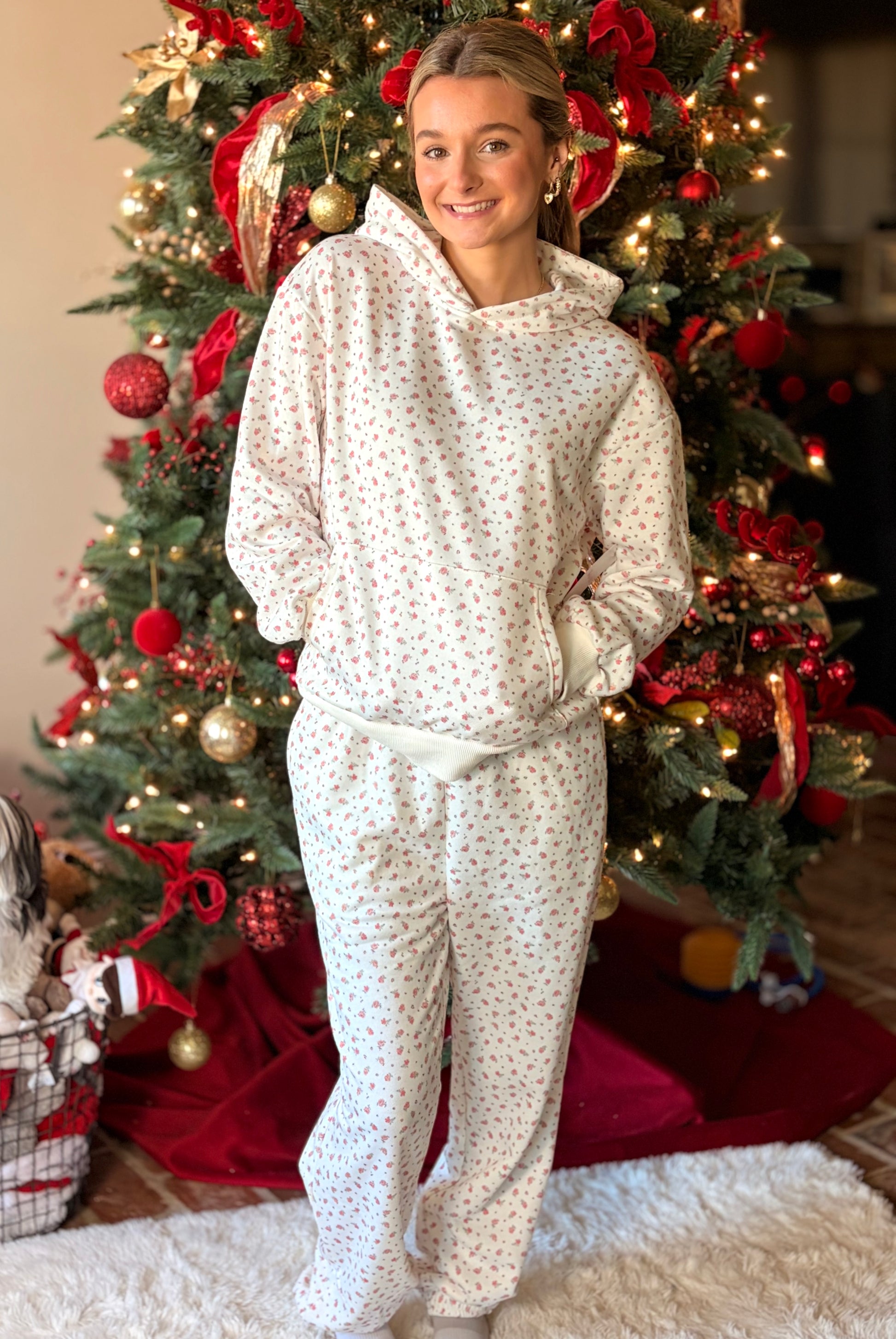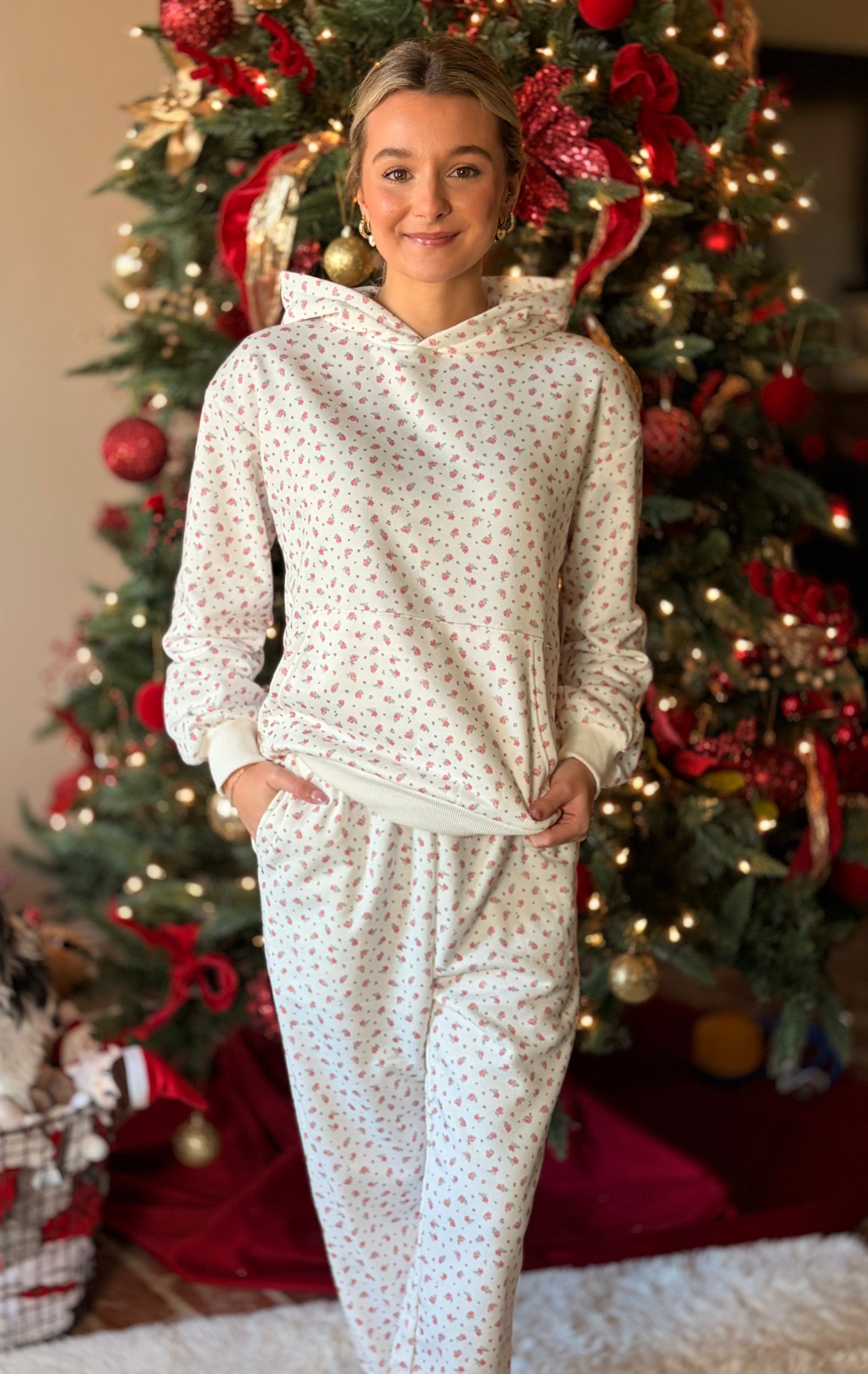 The coziest floral lounge set for the season. This soft cotton two-piece features a tiny rosebud print throughout, a relaxed hoodie-style top, and matching elastic-waist pants. Lightweight, breathable, and perfect for holiday mornings, movie nights, or everyday comfy errands.