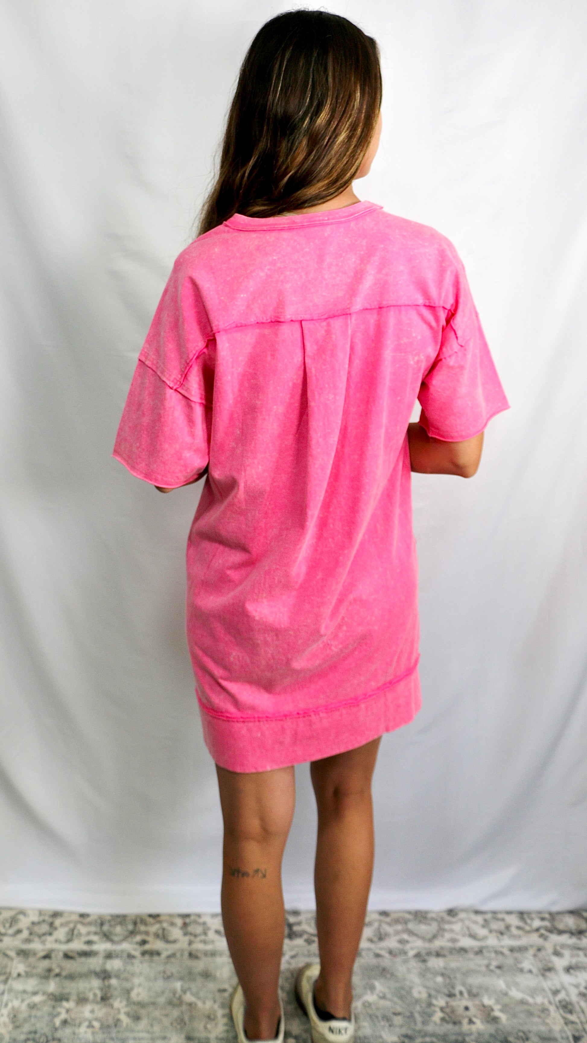 Pretty in pink and made for everyday comfort — the Rose Quartz T-Shirt Dress is your new go-to for effortless style. Crafted from soft, washed cotton with a relaxed, oversized fit, this dress is perfect for lounging, errands, or pairing with sneakers for a casual day out. The chest pocket and subtle side slits add just the right amount of detail to keep it laid-back and cute.